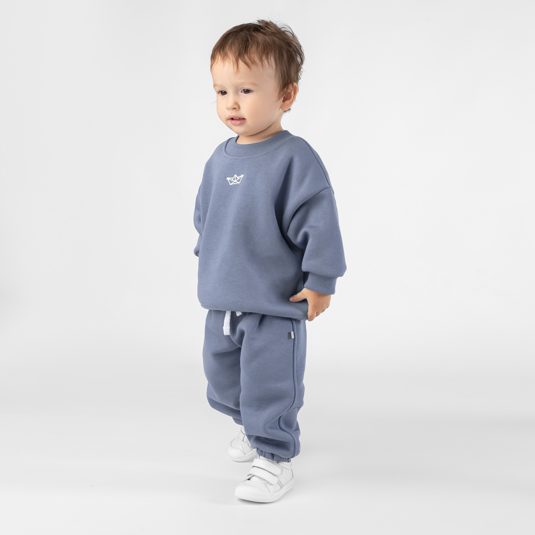 Описание: Уютный и стильный костюм для самых маленьких, выполнен из мягкого футера премиум класса с небольшим начесом. Свитшот свободного кроя, украшен оригинальной вышивкой в тематике коллекции. Линия плеча слегка приспущена мягко подчеркивая форму конструкции. Рукава на манжетах. Низ собран на мягкий пояс. Форма брючек свободная, комфортная в движении. Пояс цельнокроеный на резинке, фиксируется декоративным светлым шнуром. Низ штанин с фиксирующей резинкой.